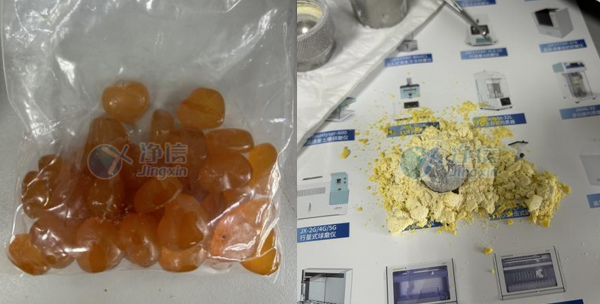 上圖為1分鐘的研磨效果,實驗結果顯示,軟糖樣品便已被研磨至細膩均勻的粉末狀,且一次可處理兩個樣品,極大地提高了工作效率。這一成果不僅證明了全自動樣品快速研磨儀在軟糖研磨中的卓越性能,也彰顯了其在復雜樣品處理方面的廣泛應用潛力。相比傳統方法,JXFSTPRP-24L不僅顯著提升了研磨效率,還確保了研磨效果的均一性和穩定性,為后續的成分分析提供了可靠保障。