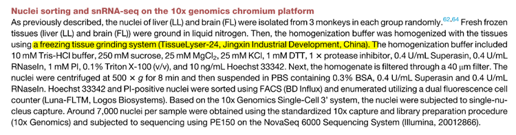 Tissuelyser-24L發揮了不可或缺的作用。研究團隊利用這種凈信的組織研磨儀,從雄性獼猴的肝臟和大腦中提取細胞核,為后續的單細胞RNA測序(snRNA-seq)分析奠定了基礎。通過精確的細胞核分離和高質量的樣本制備,研究人員能夠深入探究二甲雙胍對細胞老化的具體影響,從而揭示了其在延緩衰老中的分子機制。