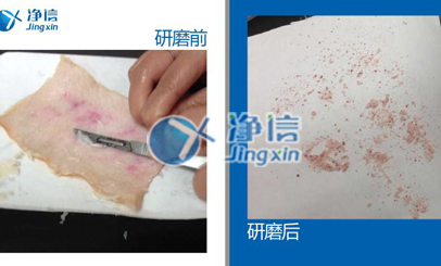 通過研磨脫脂豬皮樣品,對樣品細胞進行提純,研究其藥物作用。破碎過程中脫脂豬皮組織需要在低溫中進行,樣品本身較為堅韌,處理過程比較繁瑣,所以客戶選擇使用上海凈信研磨儀進行前處理破碎。