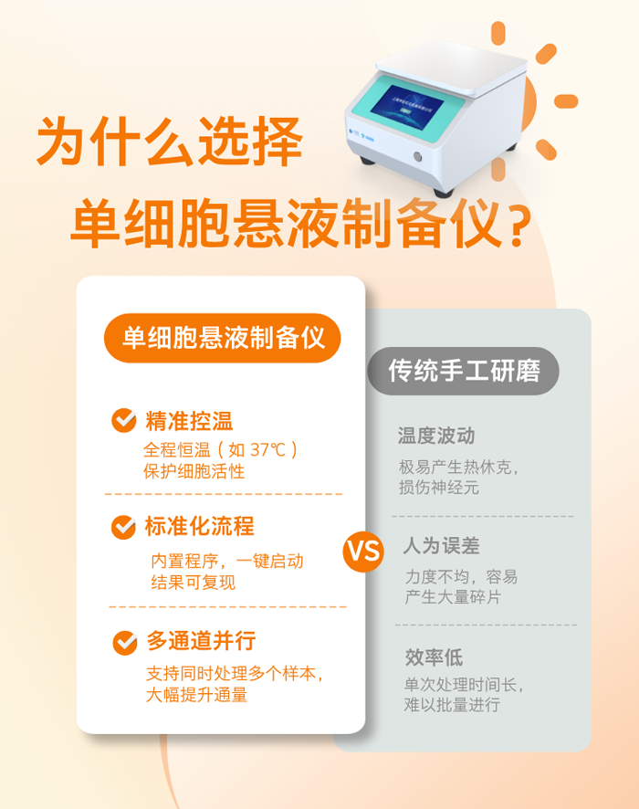 背景介紹:在神經(jīng)科學(xué)研究中,小鼠腦組織的解離一直是一道“硬骨頭”。傳統(tǒng)的手工研磨不僅耗時費力,更常因機械剪切力過大或溫度控制不均,導(dǎo)致細胞受損、活率低下。今天,我們分享一款儀器——單細胞懸液制備儀,讓您的實驗數(shù)據(jù)大大提升。