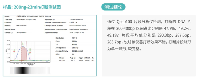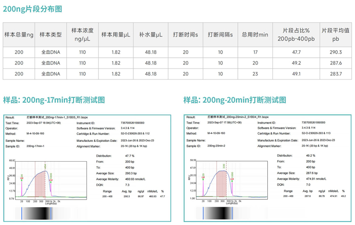 現(xiàn)針對(duì)提取的一管全血DNA樣本,投入量分別是200ng加入到0.2ml離心管中,具體實(shí)驗(yàn)條件及打斷后的片段分布圖如下: